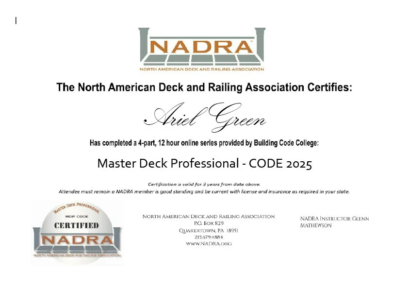 I hold the NADRA Master Deck Professional (MDP) certification, one of the most recognized credentials for deck builders in North America. The North American Deck and Railing Association promotes safety, education, and best practices in deck construction.